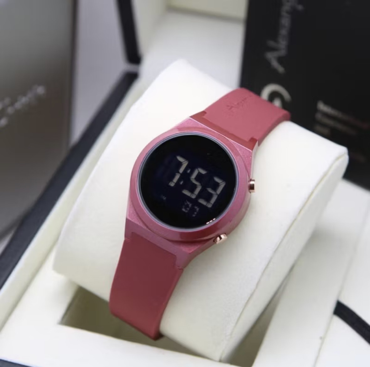 Jam Tangan Wanita Alexandre Christie Digital AC 9385LH Red Dial Black Strap Rubber