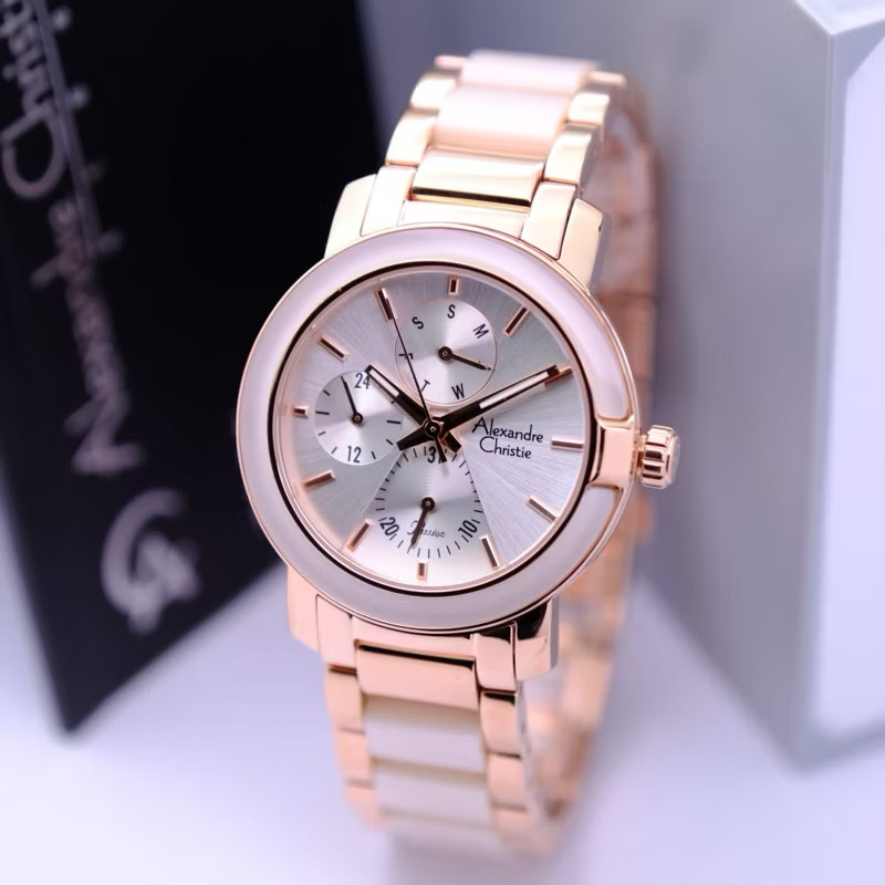 Jam Tangan Wanita Alexandre Christie Multifunction AC 2B02 BFBRGSL Rosegold White Dial Dual Tone