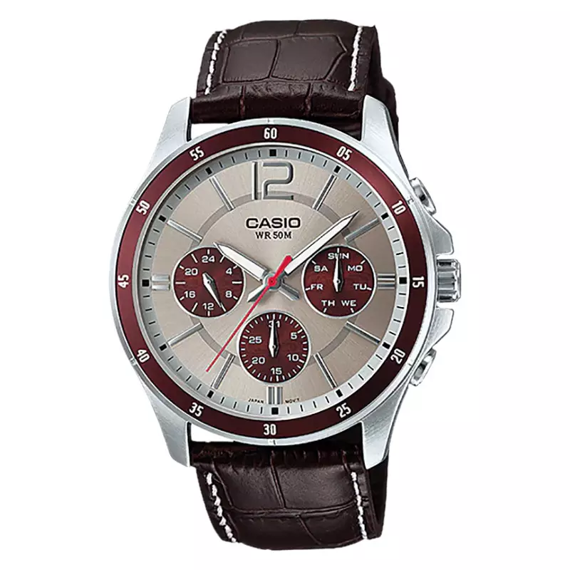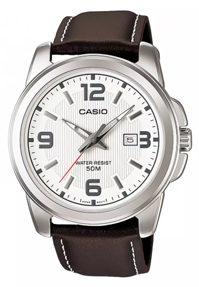 Jam Tangan Pria Casio MTP-1374L-7A1VDF Brown Silver Leather Strap