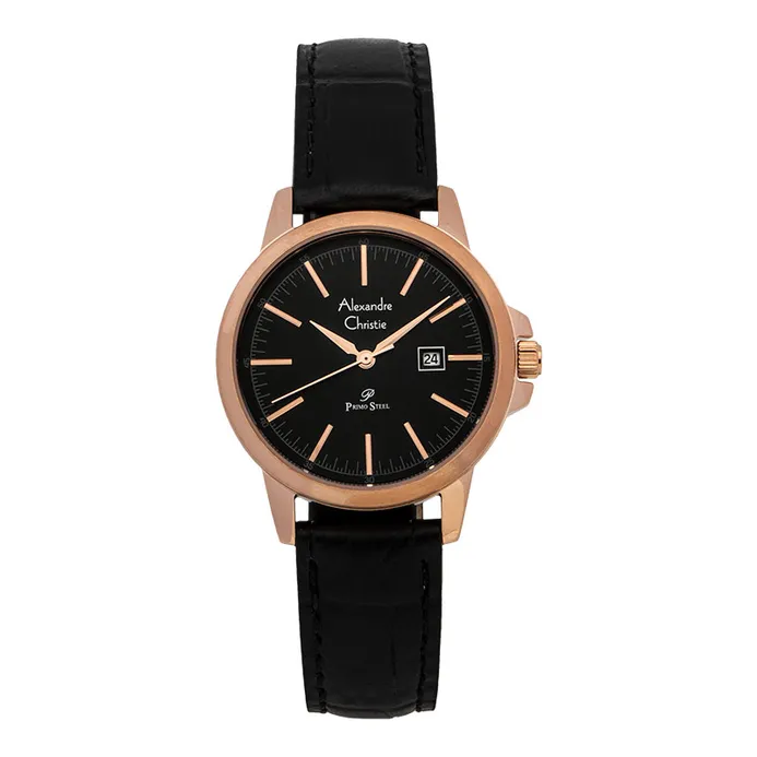 Jam Tangan Wanita Alexandre Christie Primo Steel AC 2B86 Black Rosegold Leather Strap