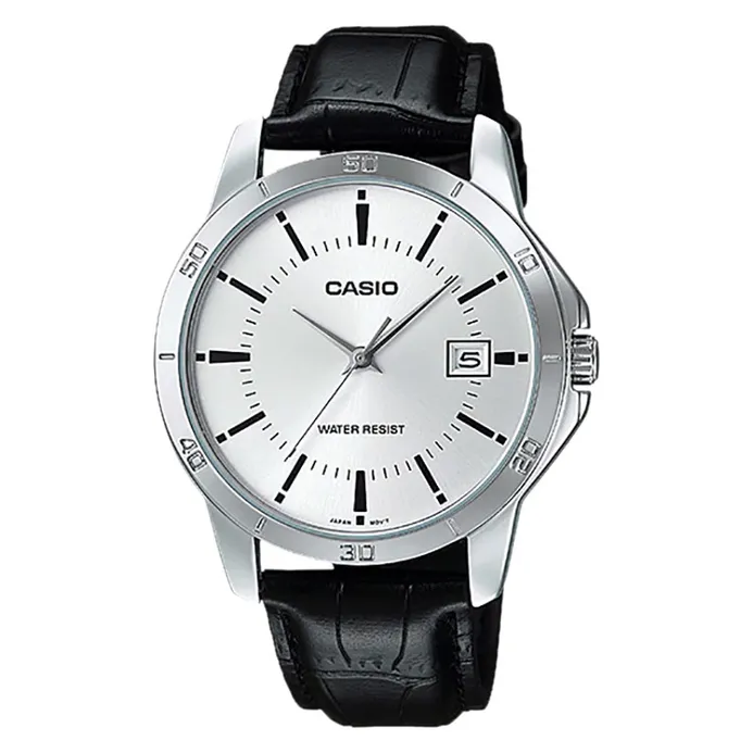 Jam Tangan Pria Casio MTP-V004L-7AUDF Black Silver Dial White Leather Strap